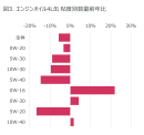 4L缶の主要な粘度では、0W-20が数量前年比3%減、5W-30が同9%減、10W-30が同10%減と減少した(図3)。そうした中、0W-16は数量前年比22%増と二桁成長を見せた他、0W-30は同4%増、10W-40は同2%増と前年を超える粘度も見られた。