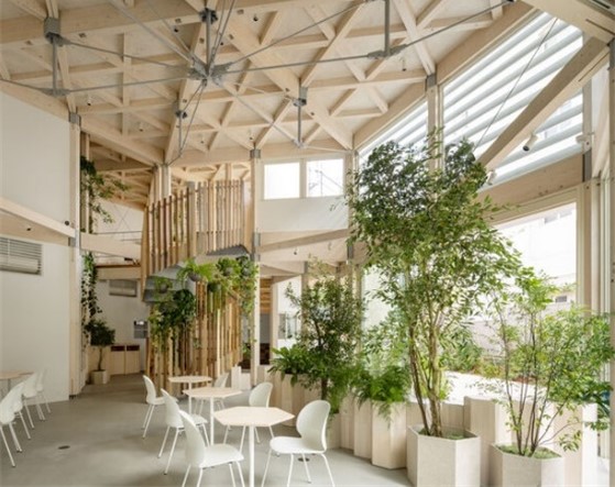 岡山県西粟倉村の間伐材を構造材として建てられた2階建て施設。