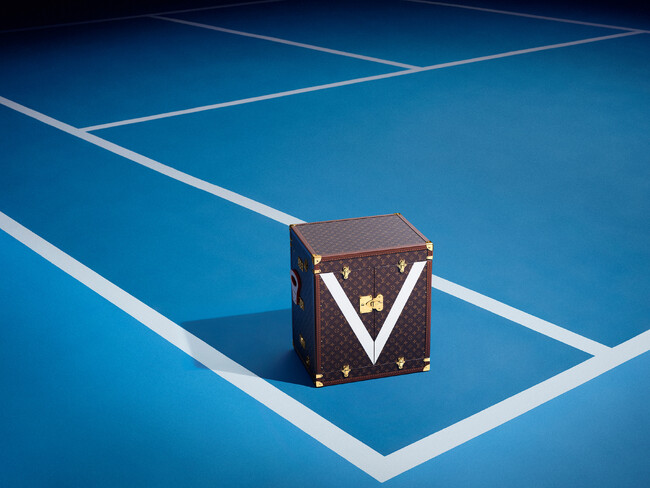 パリ郊外のアニエールにある歴史的なルイ・ヴィトンのアトリエにて、経験豊かな職人たちの手作業で製作されたこのトランクは、グランドスラムの幕開けとなる全豪オープンの初日から、トロフィーを大切に守り、運んできました。木製のフレームは、象徴的なルイ・ヴィトンのモノグラム・キャンバスで覆われ、伝統的なロジンレザーのトリミングや1860年代からルイ・ヴィトンのトランクに使用されてきたものと同じ真鍮製のコーナー金具やロック(錠前)、クラスプで仕上げられています。2枚のフロントパネルは折り返すとトロフィーが現れる仕組みになっており、印象的なホワイトカラーで「Victory」と「Vuitton」を意味する「V」が描かれています。トランクには、全豪オープンのブルーのコートから着想を得たカラーパレットに合わせ、ブルーのマイクロファイバーをライニングに採用。さらに蓋の内側には、全豪オープンのロゴ「AO」がホワイトカラーであしらわれています。