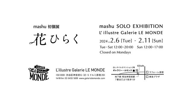 2024年1月25日に発売した『花ひらく 季節の花ことばと踊り子たち mashu作品集』を記念し、mashu氏の過去作品から描き下ろし作品まで、充実の内容をご覧いただける初の個展をL'illustre Galerie LE MONDEにて開催いたします。