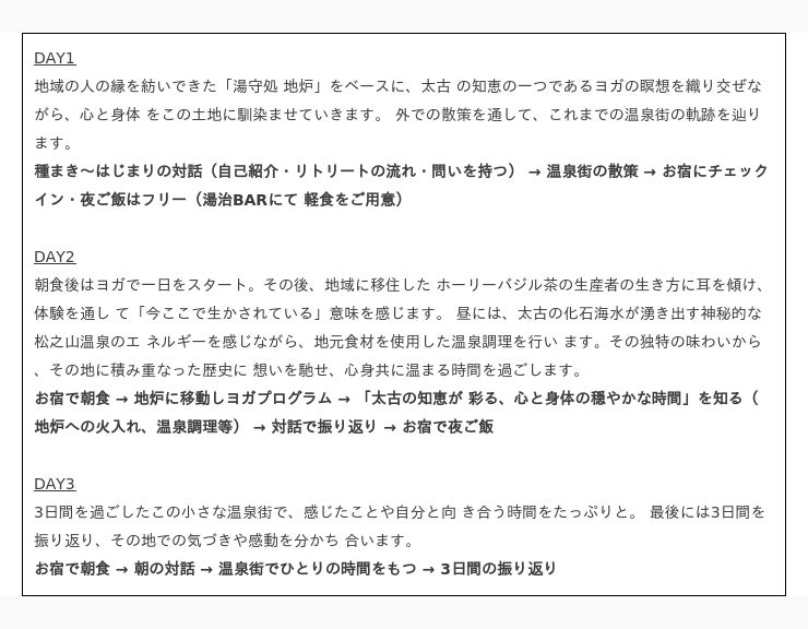 松之山温泉に秘められた太古の神秘と身体性を味わい ながら、自分に厳しい日々を送るあなたが穏やかに「今」 の自分と対話できるリトリート。 「心と身体が喜ぶYOGA」を掲げるヨガティーチャーによるガイドで今までの自分を優しく受け入れ、これからの自分を愛おしむ時間をたっぷりと味わいます。