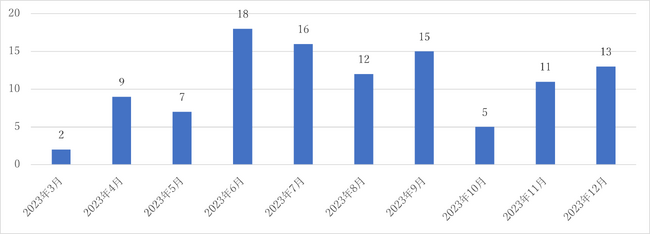 図15 2023年1月から2023年12月までの「少子化」のワードを含む月別落札件数推移