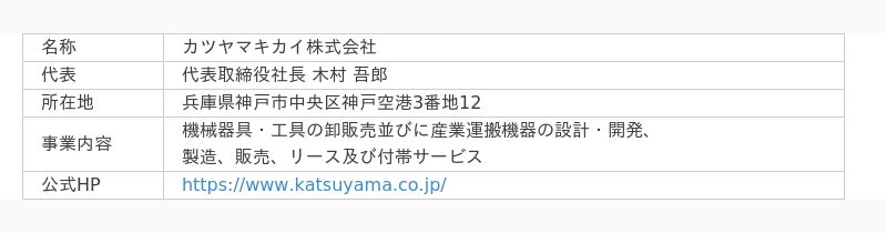 「神戸アリーナプロジェクト」が掲げるビジョンにご理解とご賛同をいただき、「オフィシャルパートナー」としてご一緒できますこと大変嬉しく思います。神戸アリーナは、50 年という長期にわたり神戸に根差し、神戸のまちづくりにまで思いを馳せて事業運営に取り組んで参ります。地元企業であるカツヤマキカイ様との協創は非常に意味があると感じるとともに、神戸空港島に立地することも含め、グローバルな展開においてもご一緒できることを楽しみにしております。これから新たな神戸の魅力づくりを共に創造していくことに期待しております。<会社概要>