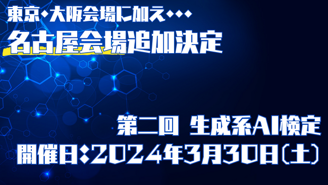 これにより、「第2回 生成系AI検定」は「東京都豊島区会場」「大阪府大阪市会場」に加え「愛知県名古屋市会場」の全国3ヶ所での開催となります。