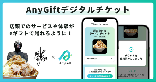 『AnyGift』を利用し、店舗で利用できるデジタルチケットをeギフトで贈ることができるようになることで、店舗への来店者数を増やすだけでなく、「歴史を刻め」・「おもしろい方へ」をまだ知らない方々にも魅力を知ってもらう機会となれば幸いです。ぜひ、ラーメンが好きなお友達や大切な方へのプレゼントにeギフトをご利用ください。