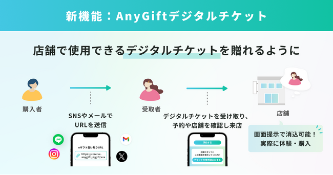 今回の「AnyGiftデジタルチケット」のリリースにより、店頭でのサービスや体験をデジタルチケットとして、eギフトで贈ることができるようになりました。通常のeギフトと同様に、住所がわからないお相手にもギフトを贈ることができ、お相手の方は受け取ったデジタルチケットを店頭で利用することができます。