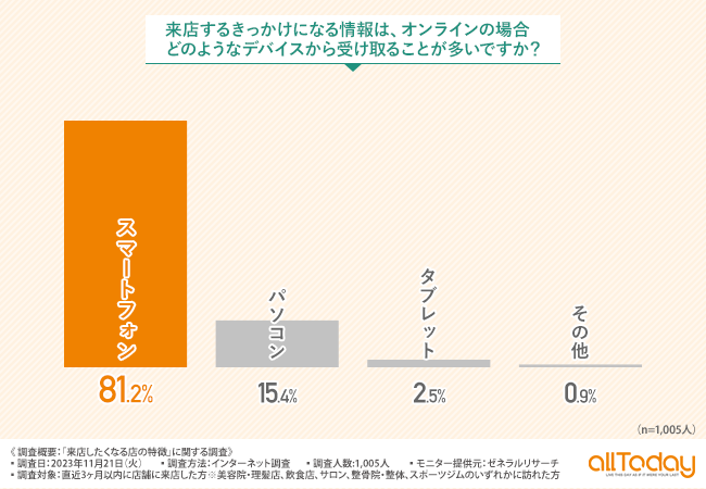 また、「来店するきっかけになる情報は、オンラインの場合どのようなデバイスから受け取ることが多いですか?」と質問したところ、『スマートフォン(81.2%)』『パソコン(15.4%)』『タブレット(2.5%)』という結果になりました。スマートフォンでの情報収拾が主流になっていることが示唆されました。