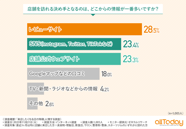 最後に、「店舗を訪れる決め手となるのは、どこからの情報が一番多いですか?」と質問したところ、『レビューサイト(28.5%)』と最も多く、次いで『SNS(Instagram、Twitter、TikTokなど)(23.4%)』『店舗公式ウェブサイト(23.3%)』という結果になりました。