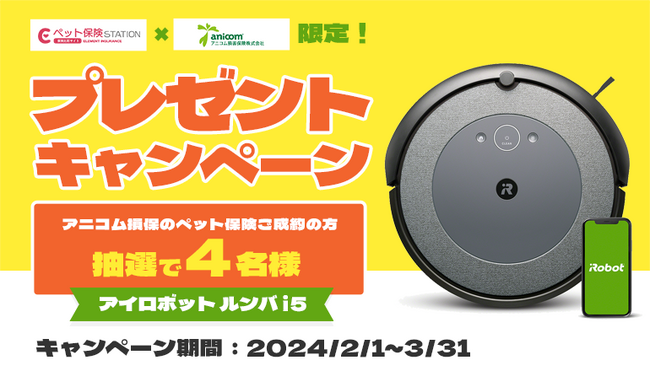 期間中にペット保険ステーション経由でアニコム損害保険株式会社の ペット保険「どうぶつ健保」へお申込みいただき、ご成約いただいた方の中から抽選で4名様に「アイロボット ロボット掃除機 ルンバ i5」をプレゼント。