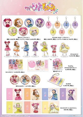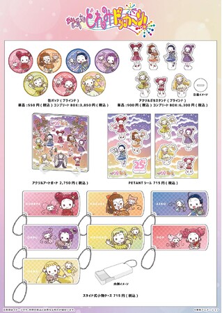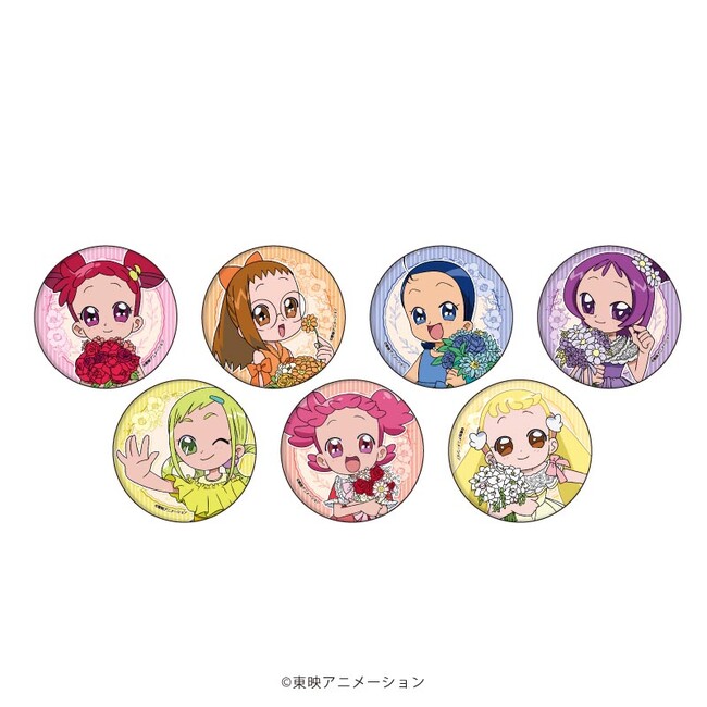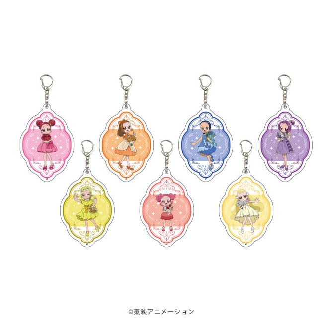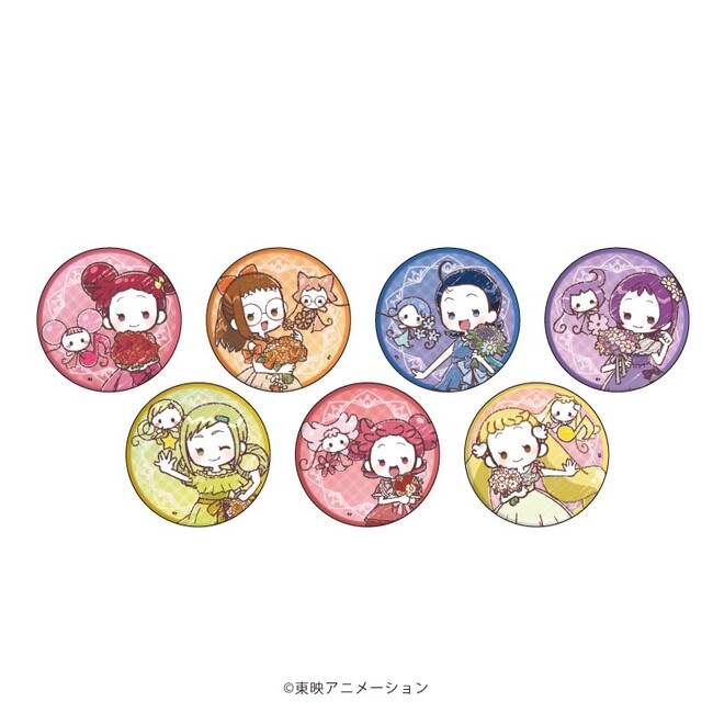 直径5.7cmの缶バッジはどれみたちのお顔をアップめに、約6.5cmのアクリルキーホルダーは美麗な衣装もじっくり楽しめるデザインになっています。