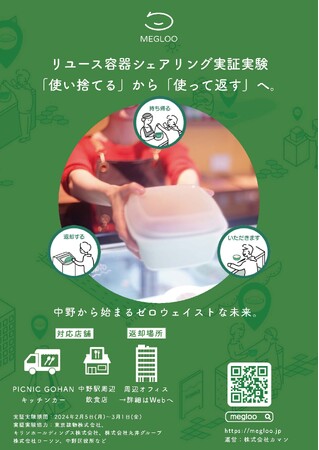 株式会社カマン(本社:神奈川県鎌倉市、代表取締役:善積真吾)は、中野区(区長:酒井直人)、キリンホールディングス株式会社(代表取締役社長:磯崎功典)、株式会社丸井グループ(代表取締役社長:青井浩)、株式会社ローソン(代表取締役 社長:竹増貞信)、東京建物株式会社(代表取締役社長執行役員:野村均)、ティーム有限会社(代表取締役社長:高瀬由紀夫)、三井化学株式会社(代表取締役長:橋本修)と共に、リユース容器シェアリングサービス「Megloo(メグルー)」の実証実験を2月5日(月)から3月1日(金)に中野セントラルパーク周辺で実施します。
