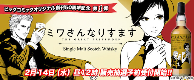 「ビッグコミックオリジナル」創刊50周年を記念して、5本連続でウイスキーをリリース! 第1弾は『ミワさんなりすます』ラベル・ウイスキー