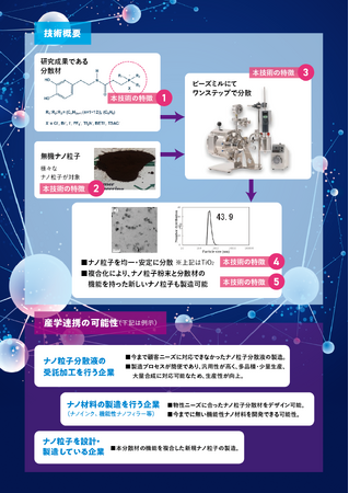 様々な無機ナノ粒子を高い分散性で安定して分散可能な分散技術、及び多機能ナノ粒子の製造技術です。
