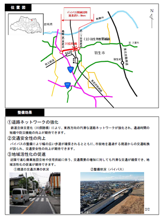 このため、県では、羽生市内の一般国道122 号桑崎(北)交差点から東武伊勢崎線を渡り、現道の北二丁目交差点までの延長約1.9km 区間について、主要地方道羽生外野栗橋線バイパスとして整備を進めてきました。このたび、このバイパスが完成し、3 月16 日(土)15 時に開通します。