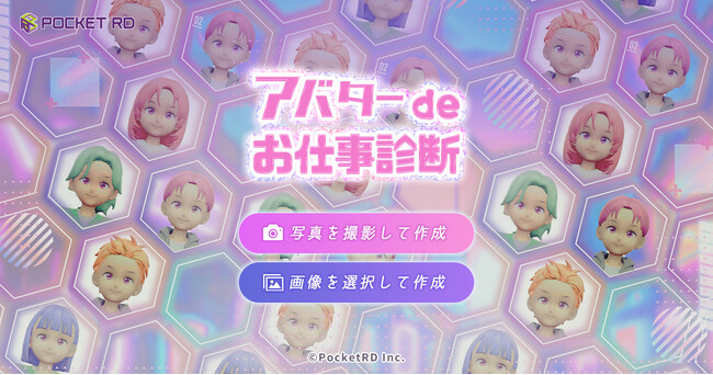 本診断はPocket RDが配信中のスマートフォン向けアプリ「MirrorMuse(※)」の写真1枚からアバターを作れるアバター生成技術を活用しました。1枚の写真を選択または撮影し、20問の質問にお答えいただくことで、自分にそっくりのアバターが心理学に基づく適職の衣装を着て生成されます。