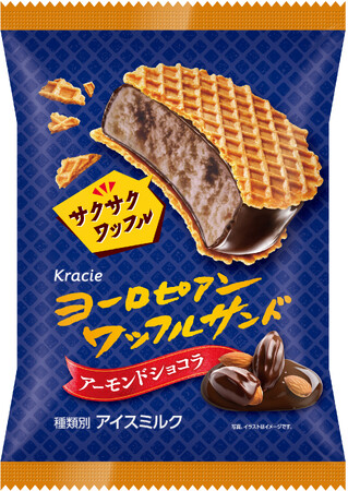 今回発売する「ヨーロピアンワッフルサンド アーモンドショコラ」は、アーモンドプラリネペーストを配合したアーモンドが香るショコラアイスを、しっとりなめらかなチョコレートでコーティングし、サクサク食感のワッフルでサンドしました。アーモンド香るショコラアイス、シュガーコーンとは異なるクリスピーな食感のワッフル、なめらかなチョコレートの一体感が味わえ、仕事の合間や終わった後のひとやすみにぴったりの商品です。