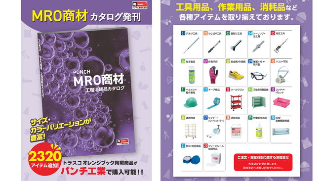 パンチ工業株式会社は、2024年2月7日(水)より、当社ECサイト「PunchCoco(パンチココ)」において、トラスコ中山株式会社が発刊する「トラスコ オレンジブック」掲載品目(MRO商材:Maintenance, Repair and Operations)の取扱いを拡大しました。これに伴い、新たにカタログを発刊しました。また、本日から3ヵ月の期間限定で、送料無料キャンペーンを行います。