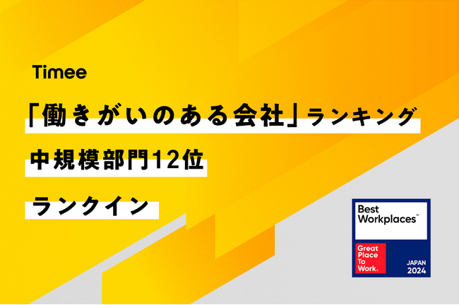 スキマバイトサービス「タイミー」を提供する株式会社タイミー(所在地:東京都港区、代表取締役:小川 嶺)は、Great Place to Work(R) Institute Japan(以下、GPTWジャパン)が発表する2024年版「働きがいのある会社」ランキングの中規模部門において、12位に選出されたことをお知らせいたします。