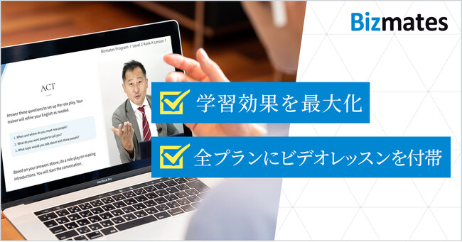 ビジネス特化型オンライン英会話事業「Bizmates」(以下「Bizmates」と言う。)(https://www.bizmates.jp/)を展開するビズメイツ株式会社(本社:東京都千代田区、代表取締役社長:鈴木 伸明 、以下「当社」と言う。)は、2024年5月8日(水)より、Bizmatesの全プランにVideo Lesson(以下「ビデオレッスン」と言う。)を付帯し、新プランに改定します。本改定により教材の予習・復習の機会を増やし、英語を効率的に学習できる環境を提供いたします。