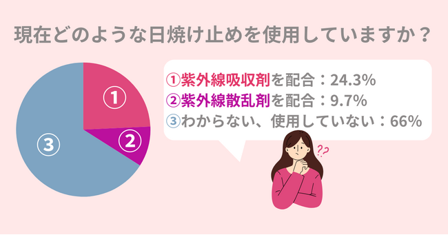株式会社アースケアは20~30歳の女性100名に「日焼け止め」に関する調査を行いました。<調査結果>66%の女性が、使用している日焼け止めに紫外線吸収剤・散乱剤のどちらが配合されているかがわからない