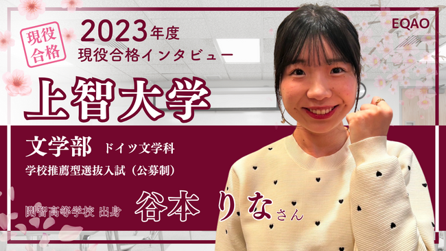 - 【公募推薦】上智英文学科専門コースリリース決定! 上智大学文学部英文学科に推薦入試で合格目指すならEQAO一択!講師の8割が現役上智大生の上智に特化した総合型選抜専門塾EQAOが全力サポートします!01/04 11:45
