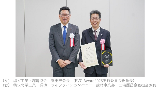 積水化学工業株式会社(代表取締役社長:加藤 敬太、以下「当社」)の環境・ライフラインカンパニー(プレジデント:平居 義幸)が2023年9月に発売した業界最大級の大容量大型塩ビ雨とい「超芯V-MAX」が、この度、『PVC Award 2023』(主催:塩ビ工業・環境協会)の準大賞(今回の最上位賞)を受賞し、2024年2月6日(火)に表彰式が行われました。