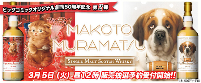 「ビッグコミックオリジナル」の表紙でおなじみ--イラストレーター・村松誠が描く愛らしい猫と犬のラベル・ウイスキーを発売!