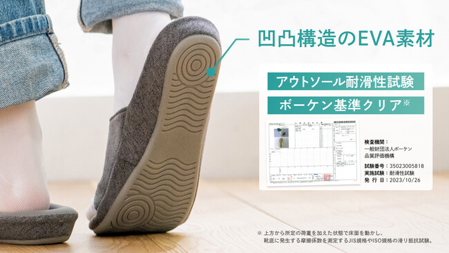 アウトソールの凹凸模様のEVA素材は適度なグリップ力があり、滑りやすいフローリングでもつまづきにくく、歩きやすいのが特長です。滑りにくさを測定する耐滑性試験ボーケン基準もクリアしています。