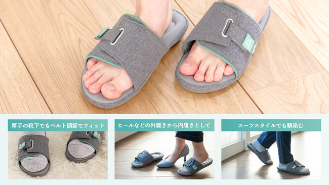 つま先オープン仕様&中敷きにはさらっとした触り心地の生地を採用しているため、夏でも蒸れにくく快適。ベルトで調整すれば厚手の靴下を履きながらでも足にフィットするため、季節や場所を問わず快適にご利用いただけます。