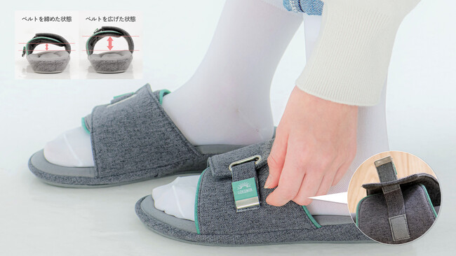 好みに合わせてサイズを自由に調整可能。さらにベルトをゆるめて、足も気持ちもふわっとゆるめるスリッパです。