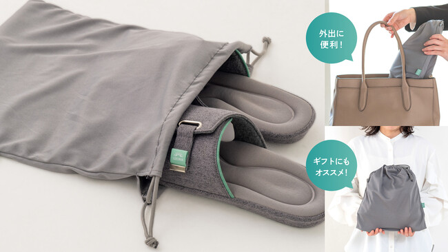 ゆるめるスリッパ専用の巾着袋が付いているから、外出先への持ち運びに便利!病院内や学校行事などはもちろん、オフィスでの履き替えや出張先・機内へ持ち込みなどビジネスシーンにもおすすめです。収納袋とスリッパ本体はシンプルなデザインのため、年代問わずギフトにも最適。