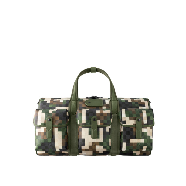 メンズ クリエイティブ・ディレクター ファレル・ウィリアムスがデザインした「キーポル 55」。ダモフラージュ・キャンバスで仕立てました。3つの外ポケットを追加することで、機能性を高めた「キーポル」です。2本のトップハンドルと、取外し & 調節可能なショルダーストラップ付き。
