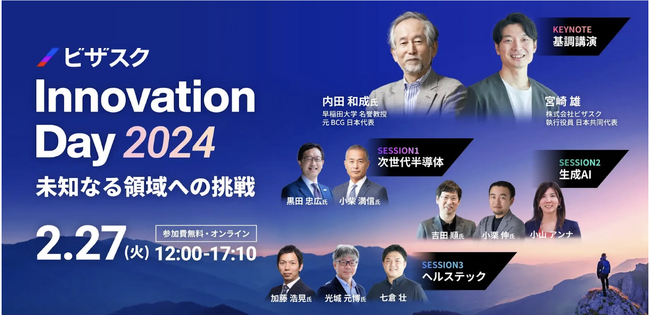 「知見と、挑戦をつなぐ」をミッションに、イノベーション創出を支えるグローバルなナレッジプラットフォームを運営する株式会社ビザスク(以下、当社)は、2024年2月27日(火)にイノベーション創出をテーマとした大型オンラインイベント「ビザスク Innovation Day 2024 未知なる領域への挑戦」を開催いたします。