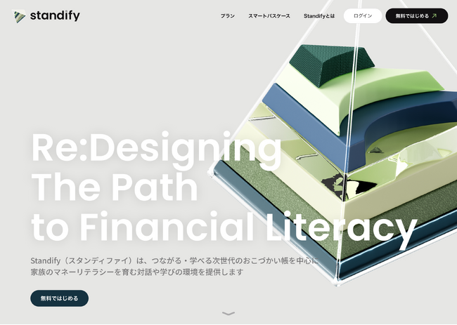 Standifyのシンボルは、人間が自立する様が由来とされている「人」を、投影された正四面体のフレームで表現、内部の積層状のマテリアルが金融リテラシーの学びや体験の積み重ねを象徴するデザインとなっています。