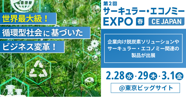 RX Japan株式会社(本社:東京都中央区、代表取締役社長:田中 岳志)は24年2月28日[水]・29[木]・3月1日[金]の3日間、東京ビッグサイトにて「第2回 サーキュラー・エコノミーEXPO【春】 -CE JAPAN-」を開催します。※GX経営Week内で開催。