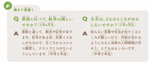 情報ページにもイラストがたっぷり。「教えて先輩!」コーナーでは、現役小学5~6年生からの質問に、現役中学生がリアルに答えたQ&Aを掲載しています。