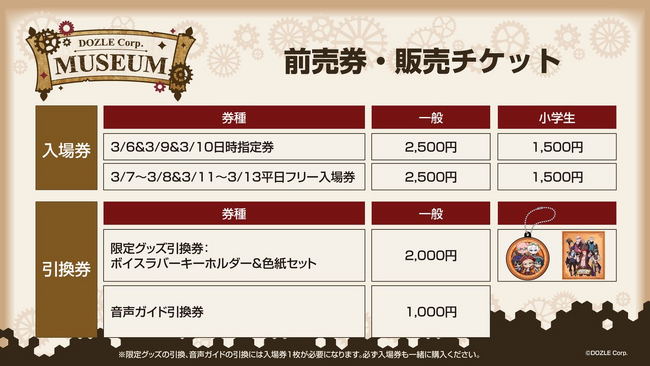 入場券の他に、ドズル社ミュージアム限定の「ボイスラバーキーホルダー&色紙セット」が含まれる限定グッズ引換券や、ドズル社の動画でも人気のナレーター「ネコおじ」の音声ガイドが聞けるチケットを販売!