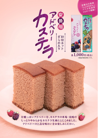 滋賀県高島市に伝わる民話『しこぶちさん』のアニメ名場面をパッケージに使用し、高島市特産の「アドベリー」を、カステラ生地にとじこめました。アドベリーとは、ポイゼンベリーという日本ではほとんど栽培されていない果実で、高島市の特産物です。このアドベリーをカステラの本場・長崎のしっとりやわらかなカステラ生地にとじこめています。アドベリーならではの上品な味わいを、是非お楽しみ下さい。