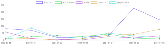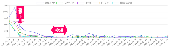 大会当日から翌日にかけては大きな差はありませんが、23年の3日め以降の落ち込みが顕著です。また2024年1月1日から4日にかけて記事数の極端な停滞が見られます。