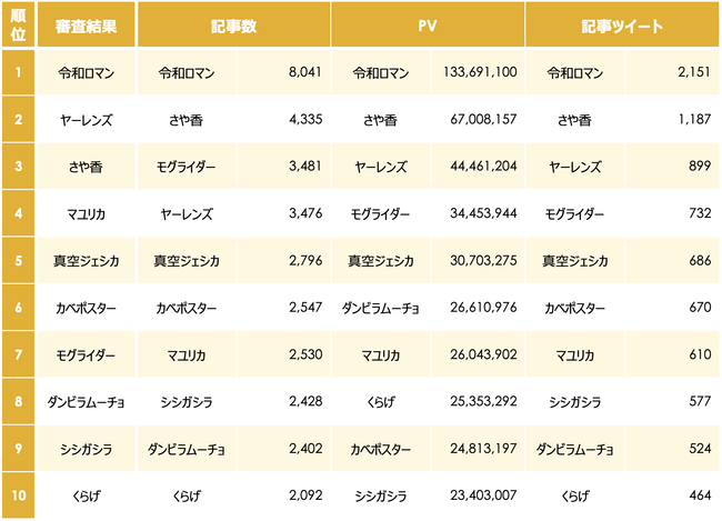 ・例外はモグライダーで、元の知名度とテレビなどの露出により、審査結果よりも記事数・PV・記事ツイート数の順位が高くなっています。