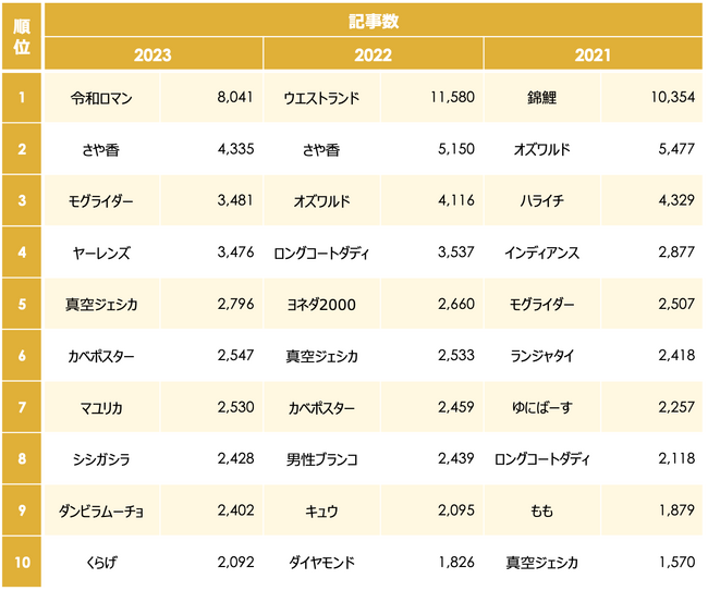 コンビごとで見ると、23年大会はランキング上位の記事数が過去にくらべて少ないことがわかります。
