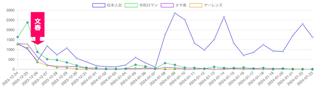 『週刊文春』が松本さんの性加害報道を始めた12月26日を境に、令和ロマンの記事数が減っていきました。その後は両者が入れ替わったままで、令和ロマンのニュースは例年の優勝者ほど伸びていません。