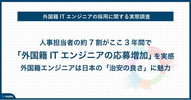 人事担当者の約7割が、ここ3年間で「外国籍ITエンジニアの応募増加」を実感 外国籍エンジニアの半数が、日本の「治安の良さ」に魅力