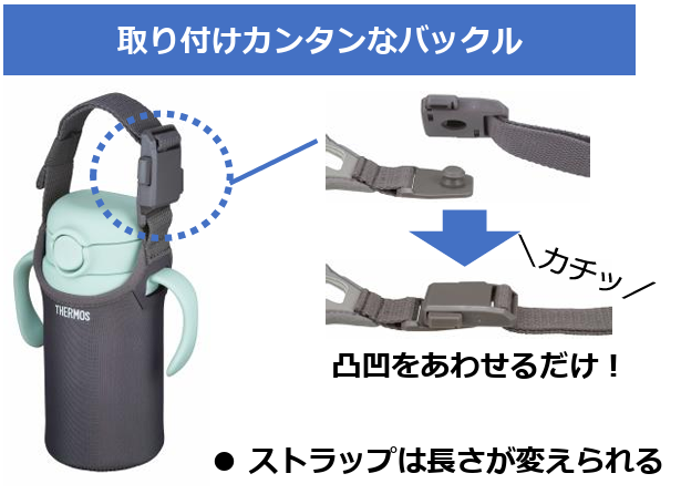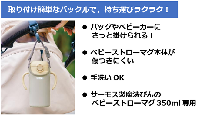 また、「専用のポーチがほしい」「落としたときに衝撃から守りたい」などのご要望を受け、『サーモス ストローマグポーチ(APK-350)』も新発売。バックル付きでベビーカーやバッグに取り付けられる専用ポーチです。
