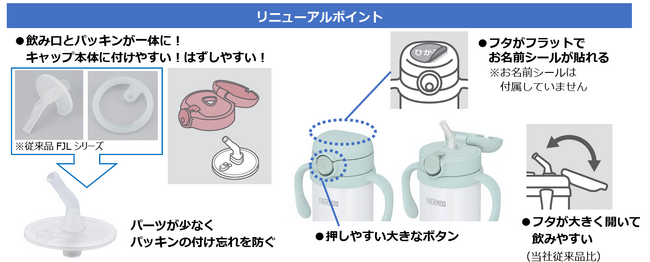 このたびのリニューアルでは、飲み口とパッキンが一体になり、パーツの取り付け、取りはずしがより簡単になりました。従来品のFJLシリーズに比べパーツ点数が少なくなりお手入れも簡単、パッキンの付け忘れを防ぎます。さらに、従来品よりフタが大きく開き飲みやすくなりました。フタの形状も保育園でご使用の際にお名前シールを上部に貼ることを考慮し、フタの天面をフラットにしてシールを貼りやすい形状にしました。