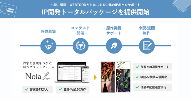 作家と企業をつなぐ創作プラットフォーム「Nola(ノラ)https://nola-novel.com/ (※1)」を運営する、株式会社indent(本社:東京都千代田区、代表取締役社長:釜形勇気 以下、「indent」)は、このたび、新規事業として漫画やWEBTOONからはじまるメディアミックス可能なIP(知的財産)創出を目指す企業の皆さまに向けて、新たに『IP開発トータルパッケージ』の取組みを開始いたしました。