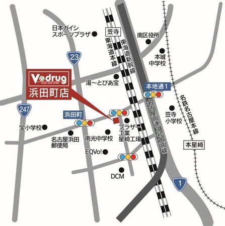 V・drug 浜田町店は、JR東海道本線「笠寺」駅から南約800mの住宅地に位置します。なお3月に店内に調剤薬局の開局を予定しております。