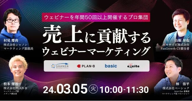 株式会社シャノン(本社:東京都港区、代表取締役社長:中村 健一郎)は、エキサイト株式会社が主催する「ウェビナーを年間50回以上開催するプロ集団 “売上に貢献するウェビナーマーケティング”」ウェビナーへ3月5日(火)に登壇します。