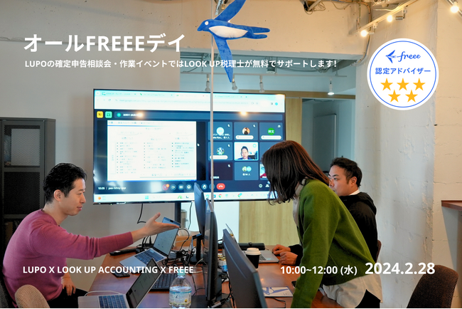 freee会計に特化した世田谷区・下北沢の会計事務所LOOK UP ACCOUNTING(運営会社:株式会社LOOK UP、代表取締役:米満建太郎)は、2024年2月28日(水)に、コワーキングスペースLUPO(LOOK UP OFFICE)で個人事業主を対象にしたfreee主催の確定申告相談会・作業イベント「オールfreeeデイ」を開催します。