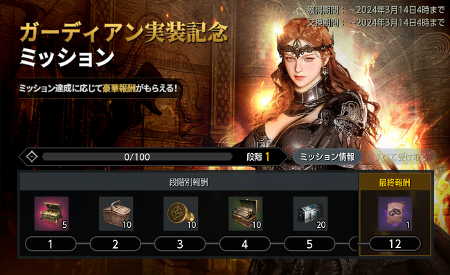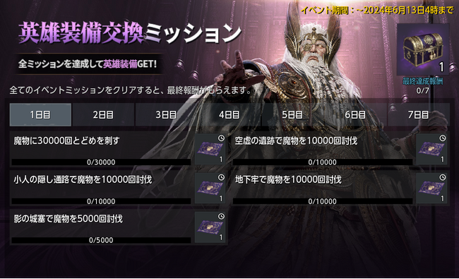 ・イベント内容:イベント期間中、各ミッションを達成することで「装備交換チケット」が獲得できます。チケットは各4種の英雄装備の箱と交換できます。全てのミッションをクリアすると「英雄武器選択箱」が獲得できます。